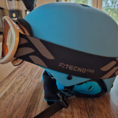 Tecno Pro lasten laskettelukypärä ja Alpina Sniper ski -laskettelulasit. Kypärä on valkoinen, siinä on moniväriset raidat ja säädettävä leukahihna. Sisäpuolella on pehmusteet ja ilmanvaihtoaukot. Takana on pidike laskettelulasien kiinnitystä varten. Alpina Sniper ski -laskettelulasit ovat pinkit, joissa on oranssit linssit ja valkoinen joustava hihna. Setti soveltuu lasketteluun ja lumilautailuun lapsille.