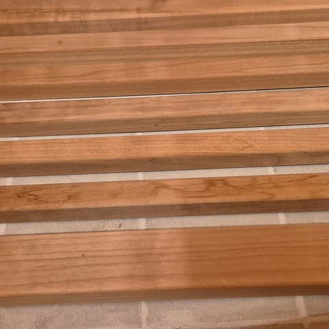 Uudet lämpöhaapaiset saunan selkänojat. Molemmissa pieniä kauneusvirheitä, isoimmista kuvat.