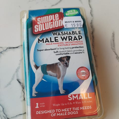 Urosvyö / Urossuoja pienelle koiralle. Paras jos ympärys 30-33cm. Meille oli liian pieni, käyttämättä jäänyt.