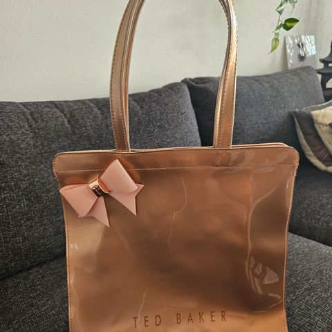 Hyväkuntoinen Ted Baker-laukku, tumman violetit väristä kiiltäväpintaista muovia. Sisällä vetoketjutasku, ei käytönjälkiä.