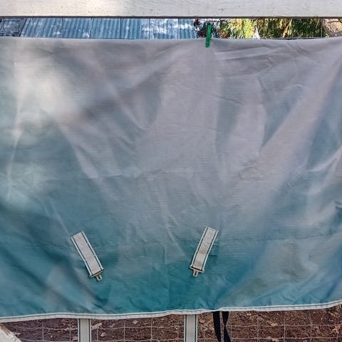 Paljon käytetty mutta vielä käyttökelpoinen Bucas irish turnout ponin sadeloimi 125cm, ollut russilla. Pesussa hukan päältä haalistunut ja muutamia hampaanreikiä paikattu kestävillä liimakangaspaikoilla. Vielä menee rymyloimena. Kaikki soljet ja kiinnikkeet ehjät. Hinta 10e noutaen, 20e postin kautta.