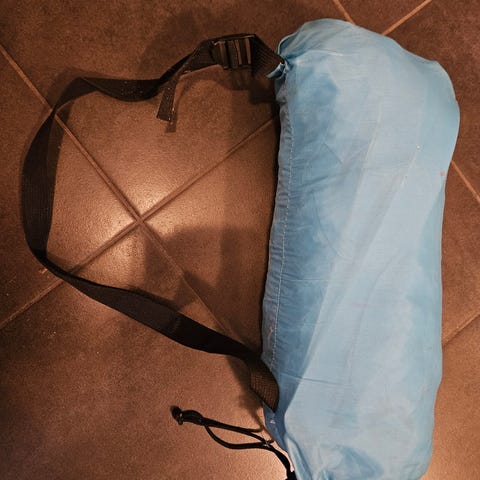 Ilmatäytteinen tuoli on kevet ja kätevä esim. rantatuoli. Myynnissä myös toinen samanlainen. Tästä hukassa sulkijanaru kuljetuspussista, pystyy helposti korvaamaan.