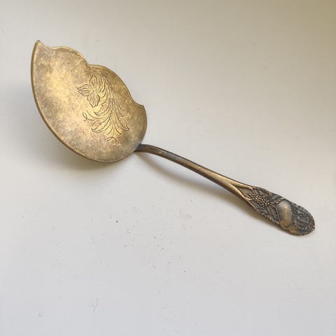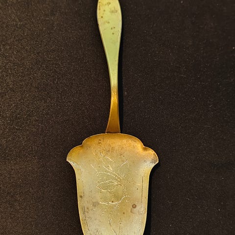 Siro vanha vintage kakkulapio tai leivoslapio. Kauniisti ajan patinoimaa messinkiä, lapiossa koristeellisia kuvioita. Takana kaiverrus 24.12.-48 eli on 1940-luvulta.