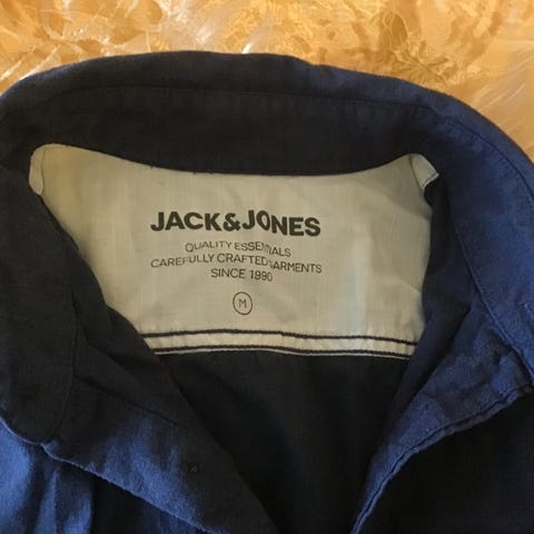 miestenvaatteita koossa S-M, kuten kauluspaitoja ja viiteen kertaan käytetty miesten Jack&Jonesin toppatakki. Melkein kaikki on puuvillaa, osassa myös pellavaa ja villaa.