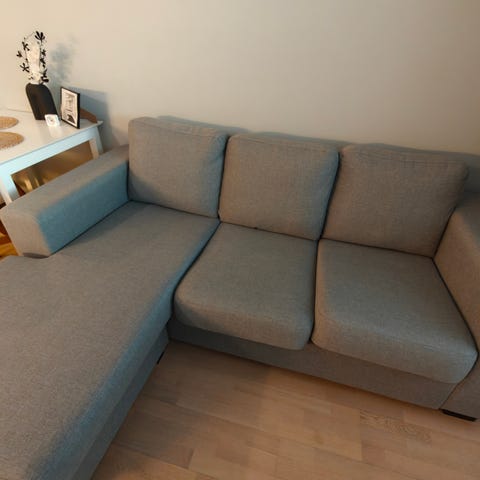Myynnissä uudehko kulmasohva. Muuten hyvässä kunnossa, mutta yhdessä istuintyynyssä puhdistustahra ja hieman likaa (näkyy kuvassa). En ole yrittänyt, mutta uskon, että lähtee tekstiilipesurilla puhtaaksi. Sohvan ulkopuolella kankaassa noin 5cm viilto. Omat kantajat mukaan ja nouto mahdollisimman pian.