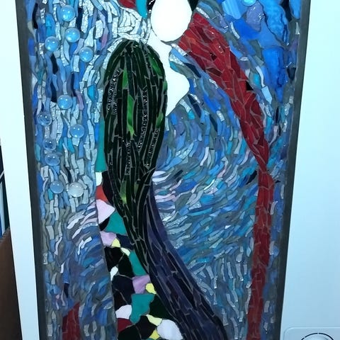 Tiffany-taulu, jossa koristeellinen ruusukuvio ja geometrinen sommittelu. Taulussa on moniväriset läpikuultavat palat, muun muassa vihreän, keltaisen, vaaleanpunaisen ja beigen sävyissä. Sopii esimerkiksi ikkunaan, seinälle tai valoa vasten ripustettavaksi sisustuselementiksi. Kuviointi muistuttaa art nouveau -henkistä tyyliä, jossa kasviaihe yhdistyy suoraviivaisiin muotoihin. Ripustus 28 cm pitkät kettingit taulun yläkulmista. Taulun koko 50x75 cm. Paksuus noin 5mm. En uskalla lähettää postissa eli nouto.