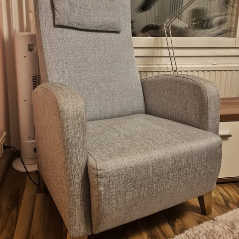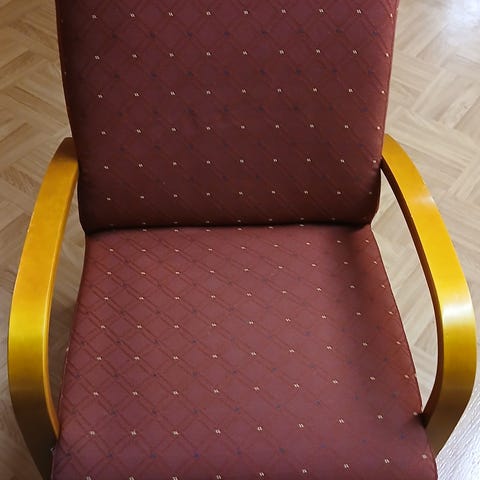 Nojatuoli, jossa korkea selkänoja ja niskatyyny. Verhoilu on vaaleavihreää kangasta ja käsinojat sekä jalat ovat puuta. Istuimessa on joustinjousitus.