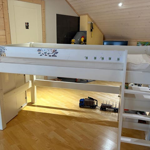 Puoliparvisänky valkoinen puu. Mitat 80x200 Lastensänky, jossa puinen runko ja sälepohja. Sängyssä on laidat sekä sivussa tikkaat ylös kiipeämistä varten.