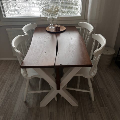 Myydään lankkupöytä. Todella tukeva ja paksut ja painavat lankut. Kotisiilistä ostettu. Mitat 87*200. On lapsiperheessä ollut. Jälkiä siis on. Ei ole uusi. Jaloista kuvaa missä jälkiä tuoleista tullut. Pöydän pinnoissa on kolhuja. Mutta ei mitään kauhean isoa ja, jos häiritsee niin hiomalla saa kuin uuden. Puuta materiaali.