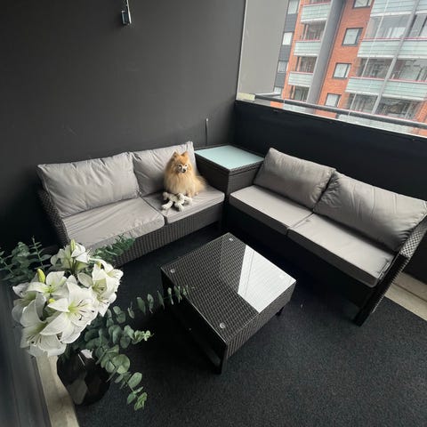 Sohvaryhmä ulkokäyttöön, materiaali polyrottinki. Kokonaisuuteen kuuluu kulmasohva tummanharmailla istuin- ja selkätyynyillä sekä suorakaiteen muotoinen pöytä hyllytasolla. Sopii esimerkiksi parvekkeelle tai terassille oleskelu- ja rentoutumiskäyttöön. Mukavat pehmusteet ja vahva teräsrunko. Ollut yhden kesän lasitetulla parvekkeella, erittäin vähällä käytöllä.