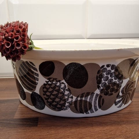 Kuvan mukainen Esteri Tomulan Columbus-sarjan Terriini, soppakulhonakin tunnettu. Suunnittelija Esteri Tomula 60-luvulla.