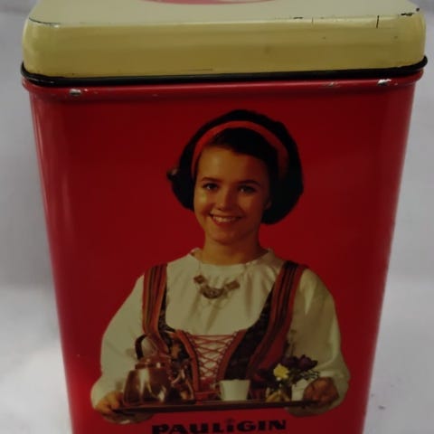 jonkun verran käyttönaarmua, kannessa kellastumaa, ruostumaa, kaunis Paula-tyttö purkki