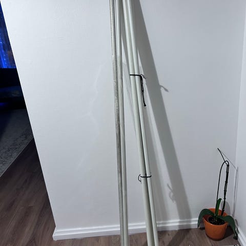 Verhotangot metallia 6kpl, teleskooppiset sekä reilusti verhokiinnikkeitä.