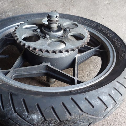 Koko pyörä räjäytyskuvina,alkuperäisvaraosanumeroilla.
