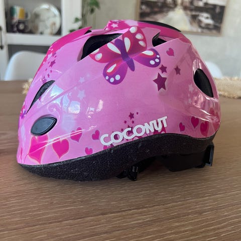 Useamman vuoden käytössä ollut luistelukypärä. Ritilä on kadonnut. Koko S.