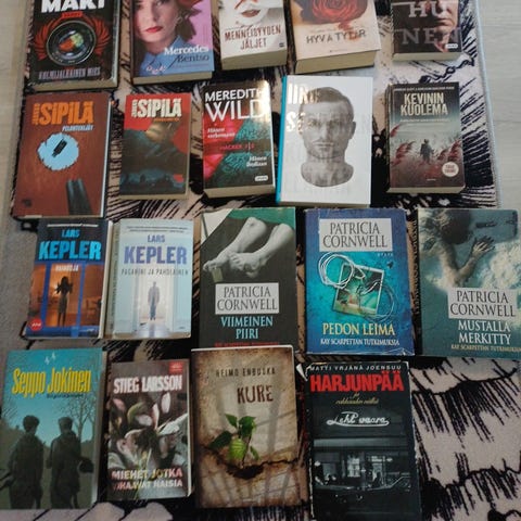 Kirjapaketti, jossa useita dekkareita ja jännityskirjoja eri kirjailijoilta. Pinossa näkyy muun muassa Leena Lehtolaisen, Samuel Bjørkin, J. M. Ilveksen, Salla Simukan, Ilkka Remeksen ja Liza Marklundin teoksia. Kirjat ovat kovakantisia ja pokkareita. Sopii lukijalle, joka etsii suomenkielistä jännitys- ja rikoskirjallisuutta yhdessä paketissa. Mukaan myös erillisessä kuvassa oleva Stephen King, pehmeät kannet.