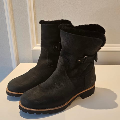 Mustat Panama Jackin nahkaiset, karvavuorelliset talvikengät koossa 39. Kärjissä naarmua, muuten ok kunto. Lankkaamalla varmasti ihan siistit vielä.