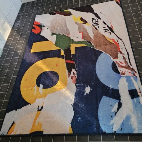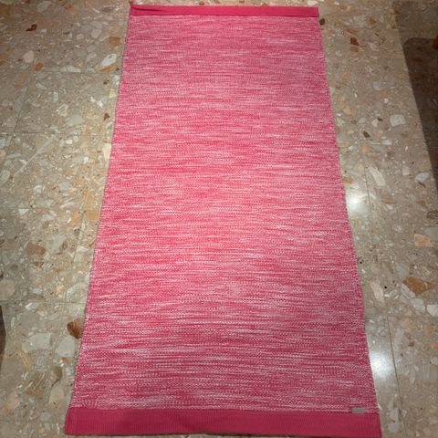 Pieni vaaleanpunainen matto. Juuri pesty. Vähän rispaantumaa toisessa päässä mutta sen saa käännettyä maton alle tai ommeltua piiloon.