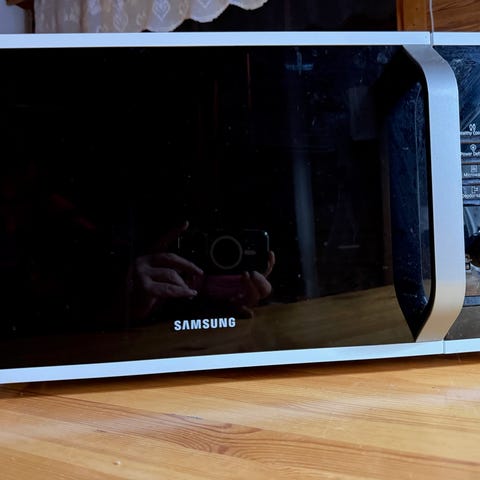 Myynnissä hopeanvärinen Samsung mikroaaltouuni.