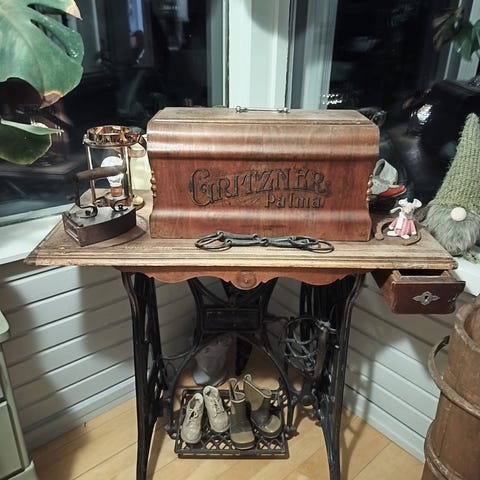 Vanha ompelukoneen laatikko.