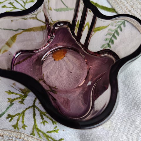 Pohjan lasin väri ei ole ihan tasainen vaan väri ”aaltoilee” hieman, mahdollisesti kakkoslaatua. Muutoin kunto todella siisti, ei naarmuja jne ja pohjan eroja ei huomaa kun tuote on pöydällä.