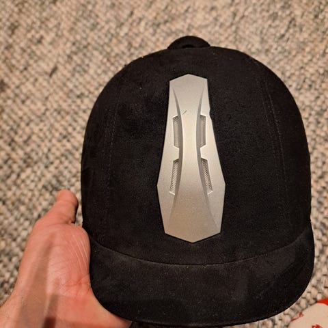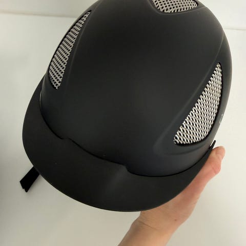 Decathlonista ostettu Fouganza merkkinen. Samettipäällysteinen ja takana satiinirusetti. Koko 58.