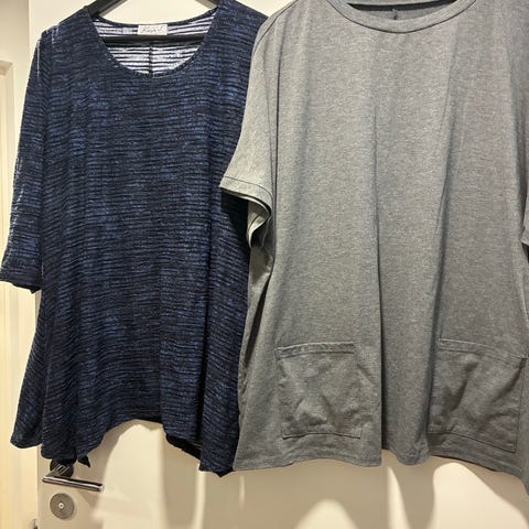 Jakut trikoota, housut trikoota ja hihaton paita. Marjapuuronpunaisen jakun nappi irtosi, tulee mukaan.