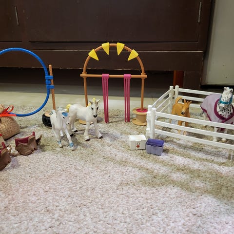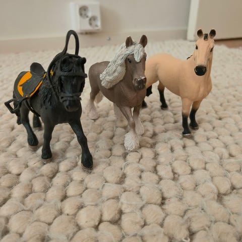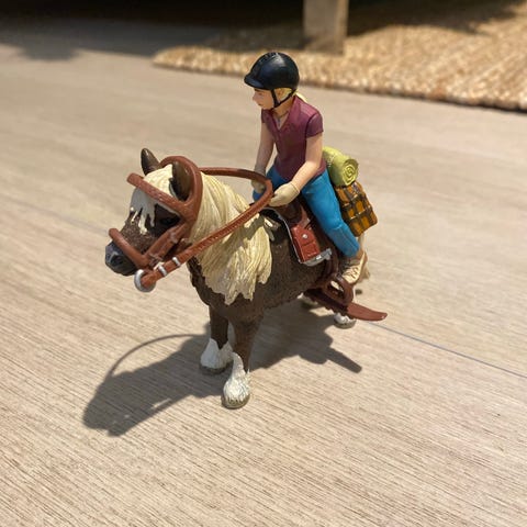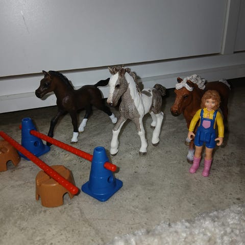 Hevonen, varsa, ratsastaja, satula, suitset, talutusnaru, harjapakki, 3 pientä harjaa ja kaviokoukku. Hinta yhteensä.