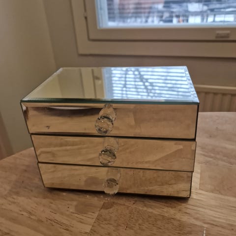 Iso peilirasia. Yhdessä reunassa pieni kolhu. Pohjassa painaumaa