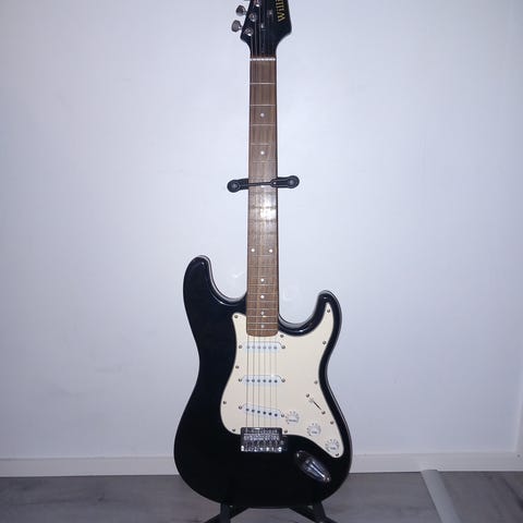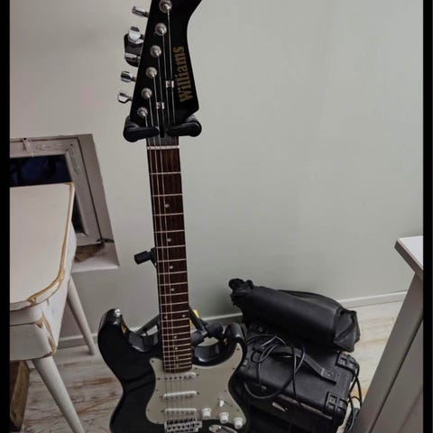 Williams-merkkinen Stratocaster-tyylinen sähkökitara ja siihen kuuluva Williams-vahvistin. Aloittelijan sähkökitarapaketti.