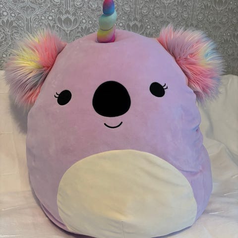Squishmallows pehmolelu, jossa on koalan muoto ja yksisarvisen sarvi. Pehmolelu on pääosin harmaa, ja siinä on vaaleanpunaisia yksityiskohtia, kuten sydänkuvio ja sarvi. Kasvoissa on suuret, pyöreät silmät ja musta nenä. Pehmolelu on pehmeää kangasmateriaalia ja sopii lapsille halittavaksi, leikkeihin tai sisustuselementiksi lastenhuoneeseen.