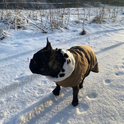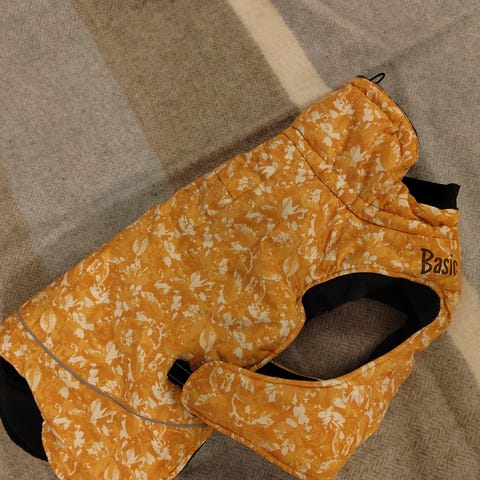 Koiran takki, ulkopinta musta ja sisäpinta vaaleanruskea. Takissa on tarrakiinnitteinen vyötäröhihna istuvuuden säätöön. Reunoissa kulkee vaalea kanttaus ja heijastin, ja takaosassa on tassukuvioinen heijastinmerkki. Sopii koiralle ulkoiluun viileämmällä säällä. Materiaali vettä hylkivää kangasta ulkopuolella ja pehmeämpää vuorimateriaalia sisäpuolella.