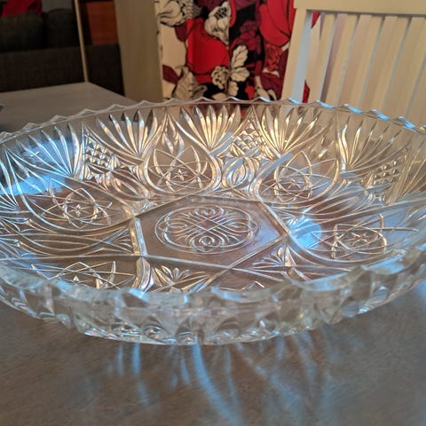 Kaunis kristallinen tarjoilulautanen, jossa geometristä kuviointia. Pohjassa (?) naarmuja, jotka näkyvät lähinnä valoa vasten. Halkaisija 28cm.