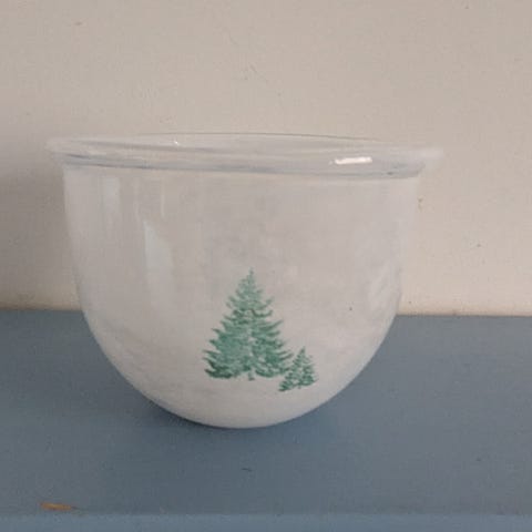 Maljakossa sinisiä ja vihreitä puita ja lintuja valkoisella lasipohjalla.