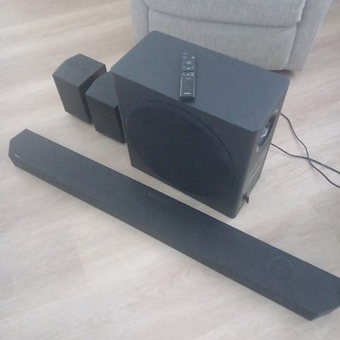 Vuoden 2025 keväällä hankittu soundbar 2.1 -järjestelmä. Laitetta käytetty hyvin vähän, mukana tulee sekä soundbarille että subille tarkoitetut virtakaapelit että optinen audiokaapeli ja kaukosäädin. VAIN noutamalla saa, en ala postittamaan.