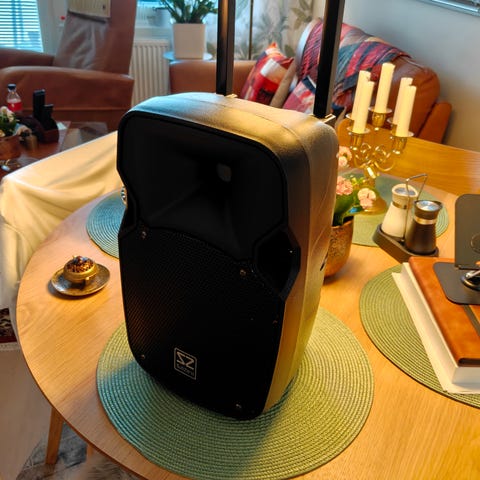 Kaiutin on musta ja siinä on kantokahva sekä ulos vedettävä vetokahva helpottamaan siirtämistä. Sopii esimerkiksi musiikin toistoon ja puhekäyttöön eri tilaisuuksissa.