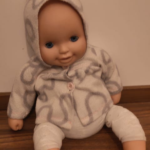 Myydään kuvan nukke, kaukalo ja tarvikkeet.
