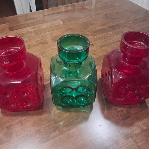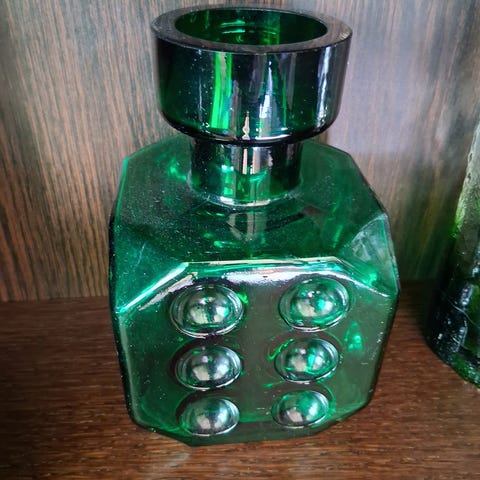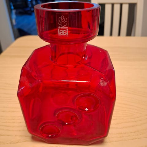 Tämä esine on punainen Riihimäen Lasin "Noppa" tai "Arpa on heitetty" -koristepullo.