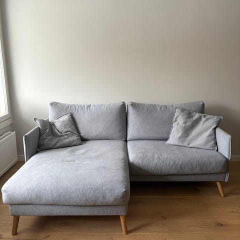 Belluksen harmaa divaani sohva. Sohva on hyvässä kunnossa, lukuun ottamatta oikean takakulman pientä noin 2cm kankaan repeämää. Tullut sohvaan sen oston kuljetuksen yhteydessä tai suoraan jo tehtaalla tarkempaa tietoa ei minulle osattu silloin kertoa.