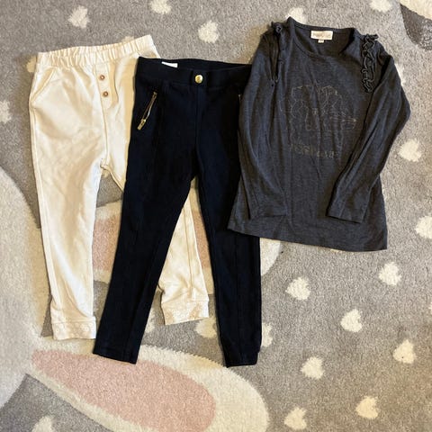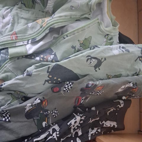 Myydään hyväkuntoinen setti puuvillaisia vaatteita: Muumi-asu, pop&vo-hoisut ja harmaat peruskollarit