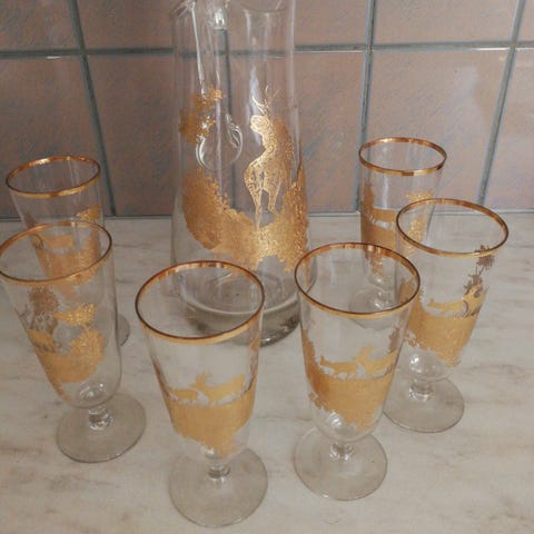 Vintage-lasisarja, jonka mukana tulee esittelylaatikko, tai saksalainen. Kiinnostavimpana elementtinä on metallinen leima tai medaljonki, jossa on heraldinen kotka, yleinen symboli eurooppalaisessa ikonografiassa.Tuotteen tiedot ja tunnistusObjektin tyyppi: Lasillisten setti metallipidikkeissä (rocks-tyylinen) samettisessa kotelossa.Ikonografia: Metallinen leima esittää kruunattua kotkaa, joka muistuttaa saksalaista keisarikotkaa (Reichsadler), jota käytettiin 5 ja 10 Pfennigin kolikkoina 1800-luvun lopulla.Materiaali: Tuet ja leima ovat tehty tinasta (pewter) ja jokaisessa on eri värinen kivi.