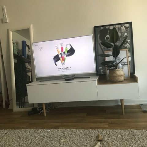 Hyväkuntoinen tv-taso. Tv-taso jaettu neljään osaan. Keskellä on avautuvat lasikaapit ja reunoilla on avautuvat valkoiset kaapit. Taso on valkoinen väriltään ja pääliosa on tummempaa puuta.