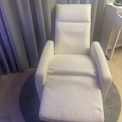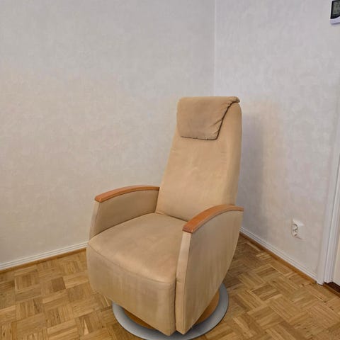 Iskun lepotuoli, valkoinen nahka/kromi jalustaristikko. Erittäin mukava istua. Keinunnan lukitus ja keinunnan jäykkyyden säätö, pyörivä istuin sekä säädettävä keinumekanismi joka voi lukita. Irrotettavat selkä- ja istuintyynyt.