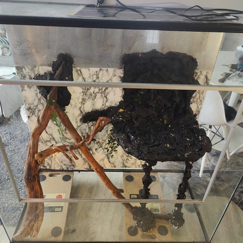 Torni on alunperin rakennettu yhtenäiseksi mutta muuton ja tiukan portaikon takia jouduttu jälkeenpäin sahaamaan kahteen osaan jotta saatiin talon yläkertaan, katso kuvat. Ei ole siis käytettävissä kahtena erillisenä terraariona. Ulkopuolelle löytyy mustat listat joilla sivujen saumat saa peittoon.