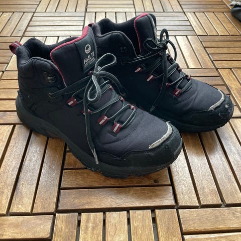 Kerman väriset toppakengät joissa käytön jälkeä ja toisesta kengästä kantapään kohdalta vuori rikkoutunut, edelleen kuitenkin käyttökelpoiset, vaikka paksun villasukan kanssa.