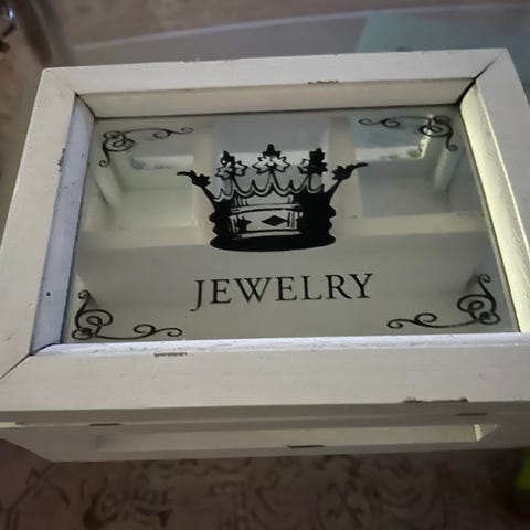 Kaunis puukorurasia, jossa tumman puun sävyinen runko ja kukkakuvioidut lasiovet, yläkannessa peili. Sisältää neljä laatikkkoa. Yläosassa peili ja pyörivät telineet roikkuville koruille.