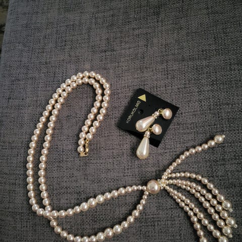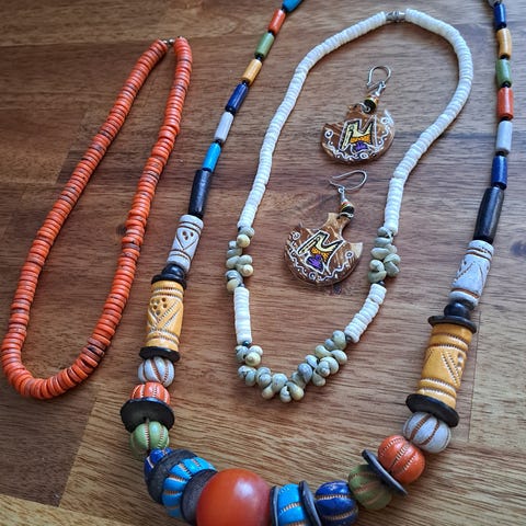 Neljä hyväkuntoista erimittaista ja -mallista helmikaulakorua. 2 kpl joissa vaaleita ja 2 kpl joissa ruskeita helmiä. Materiaalina pääosin muovi, ilman jalometalleja tai -kiviä. Yhdet vaaleat puuhelmet. Toiset vaaleat helmet todella pitkät.