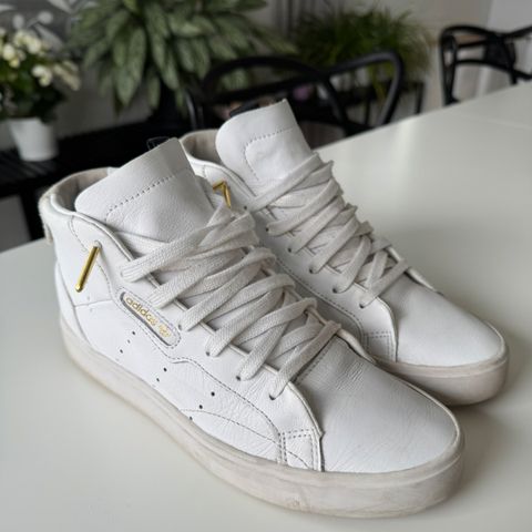 Laadukkaat nahkaiset tennarit, jotka kaupassa sopivat, vaan käyttöön hamuillessa sittenkin liian pienet. Adidas, sleek, koko 38 ja 2/3 tai 5 1/2. Valkoiset hillitysti kultaisilla lisillä. Käyttämättömät. Laput kiinni.