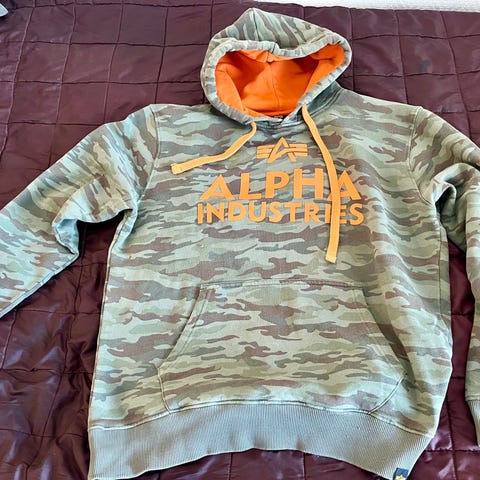 Alpha Industries miesten collegepaita koossa L. Materiaalina puuvilla. Väriltään kirjava, kuvioinniltaan maastokuvioinen. Pitkähihainen malli, jossa resorit helmassa, hihansuissa ja pääntiellä. Soveltuu arkikäyttöön ja vapaa-aikaan.
