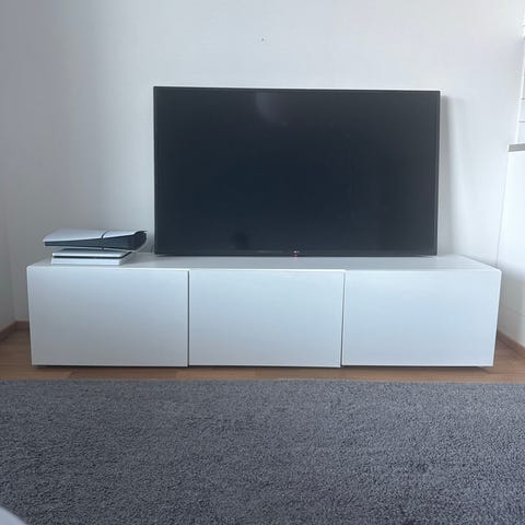 Ikea bestå-sarjan matala senkki / TV-taso. Valkoinen, kiiltävät ovet ja mukaan myös lasiovet (saa halutessaan / tarpeen mukaan vaihtaa). Mukaan myös valkoinen lasilevy tason päälle. Yksi hylly sisällä.